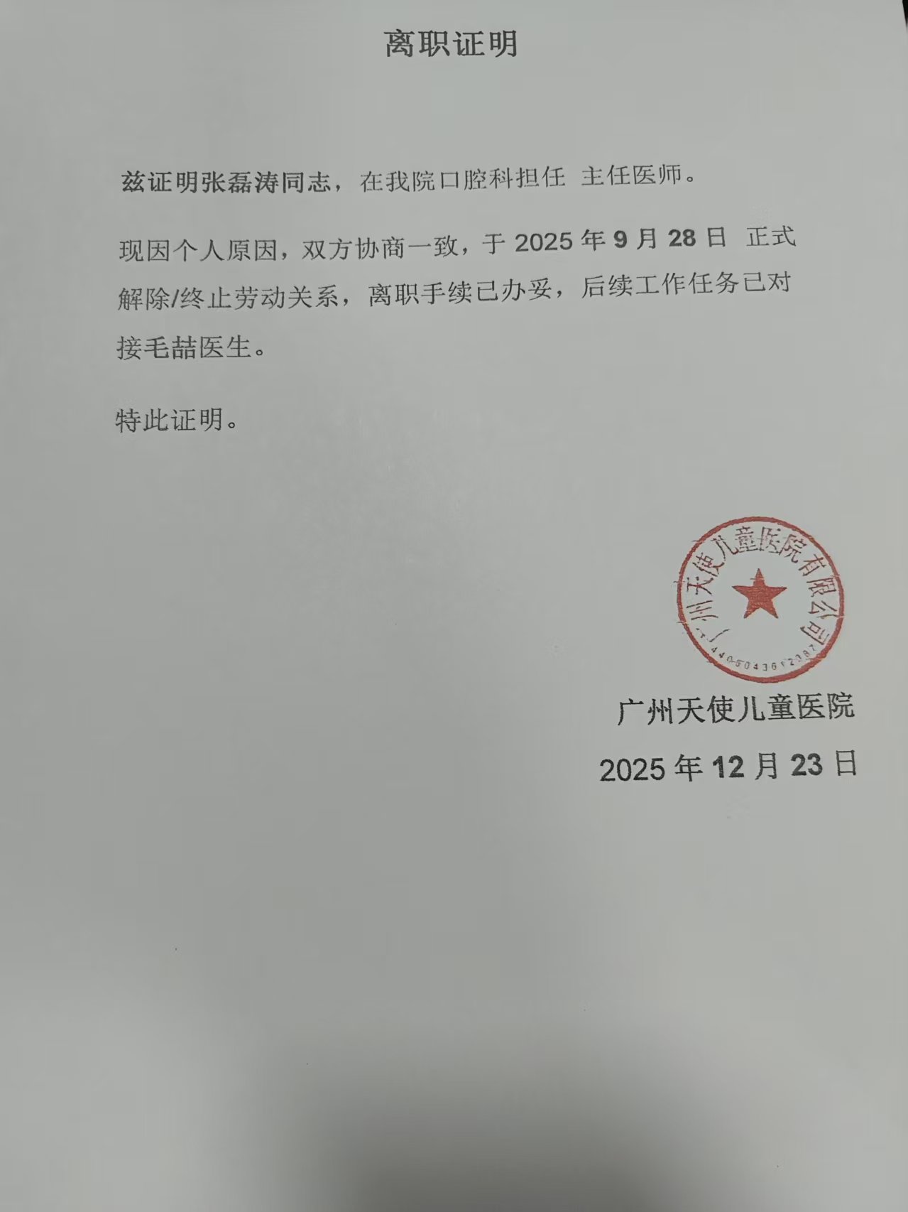 现因个人原因,双方协商一致,于2025年9月28日正式解除/终止劳动关系,离职手续已办妥,后续工作任务已对接毛喆医生。